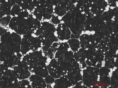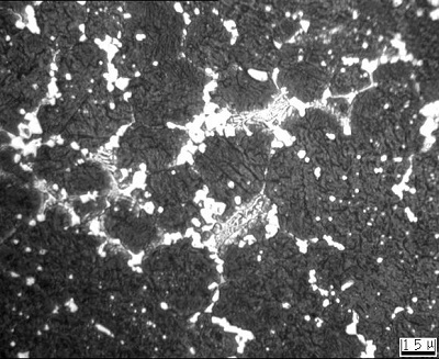 過 燒  在金相組織中晶界上出現(xiàn)萊氏體共晶組織,并呈塊狀或半網(wǎng)狀分布(圖2),還有可能出現(xiàn)黑色組織。